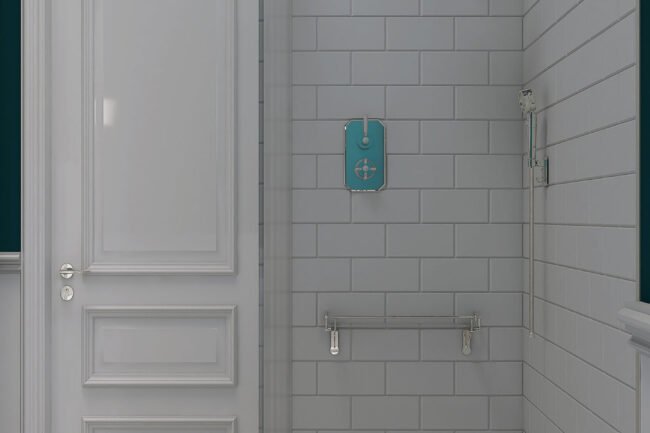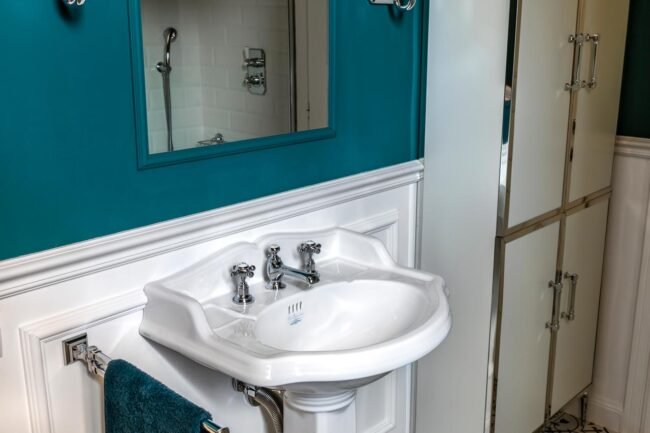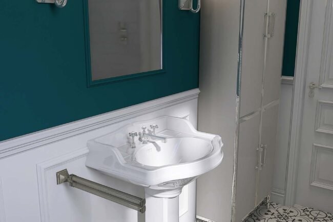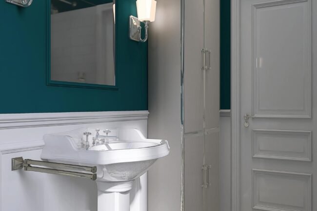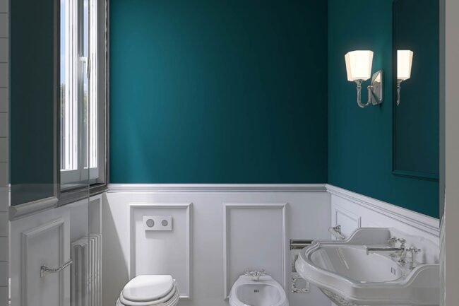 Abbiamo selezionato sanitari in stile inglese e una rubinetteria dal design retrò per dare una nota di eleganza al bagno. La finestra esistente è stata mantenuta, ma abbiamo apportato una trasformazione estetica tinteggiandola. Sul lato decorativo, abbiamo aggiunto cornici alle pareti, creando boiserie in sintonia con il resto dell’appartamento. Le boiserie sono state dipinte di bianco per ampliare lo spazio e consentire l’introduzione di un audace colore ottanio nelle pareti, conferendo al bagno un’eleganza distintiva.