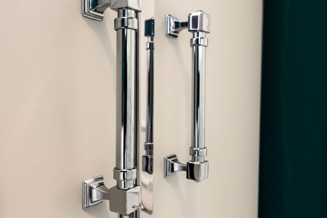 Per garantire una coesione stilistica, le appliques a base quadrata sono state scelte in armonia con gli accessori e le maniglie del mobile, creando così una continuità di stile che unisce ogni elemento del bagno in una composizione coerente ed elegante. Il risultato finale è un bagno che unisce con maestria passato e presente, offrendo un ambiente accogliente e di tendenza.